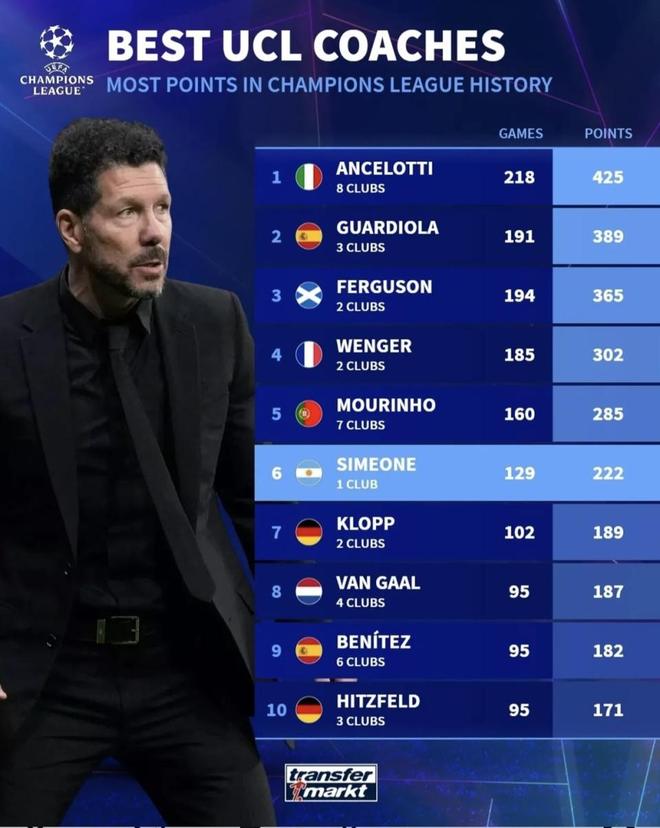 最近转会市场列出了一份欧冠主帅历史积分榜,西蒙尼排在第6。排在他前面的依次是安切洛蒂、瓜迪奥拉、弗格森、温格和穆里尼奥。如果单看冠军数量,西蒙尼确实吃亏。但如果把执教的平台、球队的资源以及持续带队的时间都算进去,他这个第6名其实很不简单。根据欧足联最新的数据,安切洛蒂带队打了218场欧冠赢下124场,瓜迪奥拉189场117胜,穆里尼奥154场80胜,西蒙尼则是126场63胜,全都是历史顶级水平。最关键的是,西蒙尼这126场几乎全是在马竞一家俱乐部完成的。在这些顶级教练里,这种长期在同一支球队持续打出成绩的情况非常罕见。